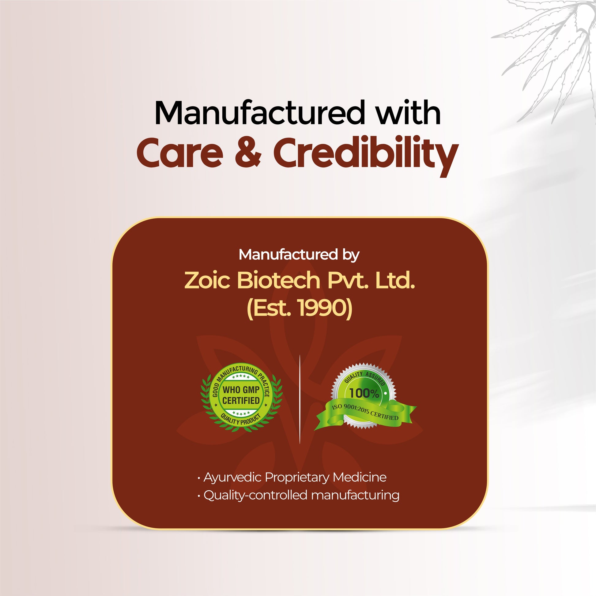 Established in 1990, Zoic Biotech has been delivering high-quality, science-backed formulations to millions of customers across India and overseas. Every Viayu product is manufactured in our GMP, ISO & AYUSH-certified facilities, ensuring purity, safety, and consistent results you can rely on.